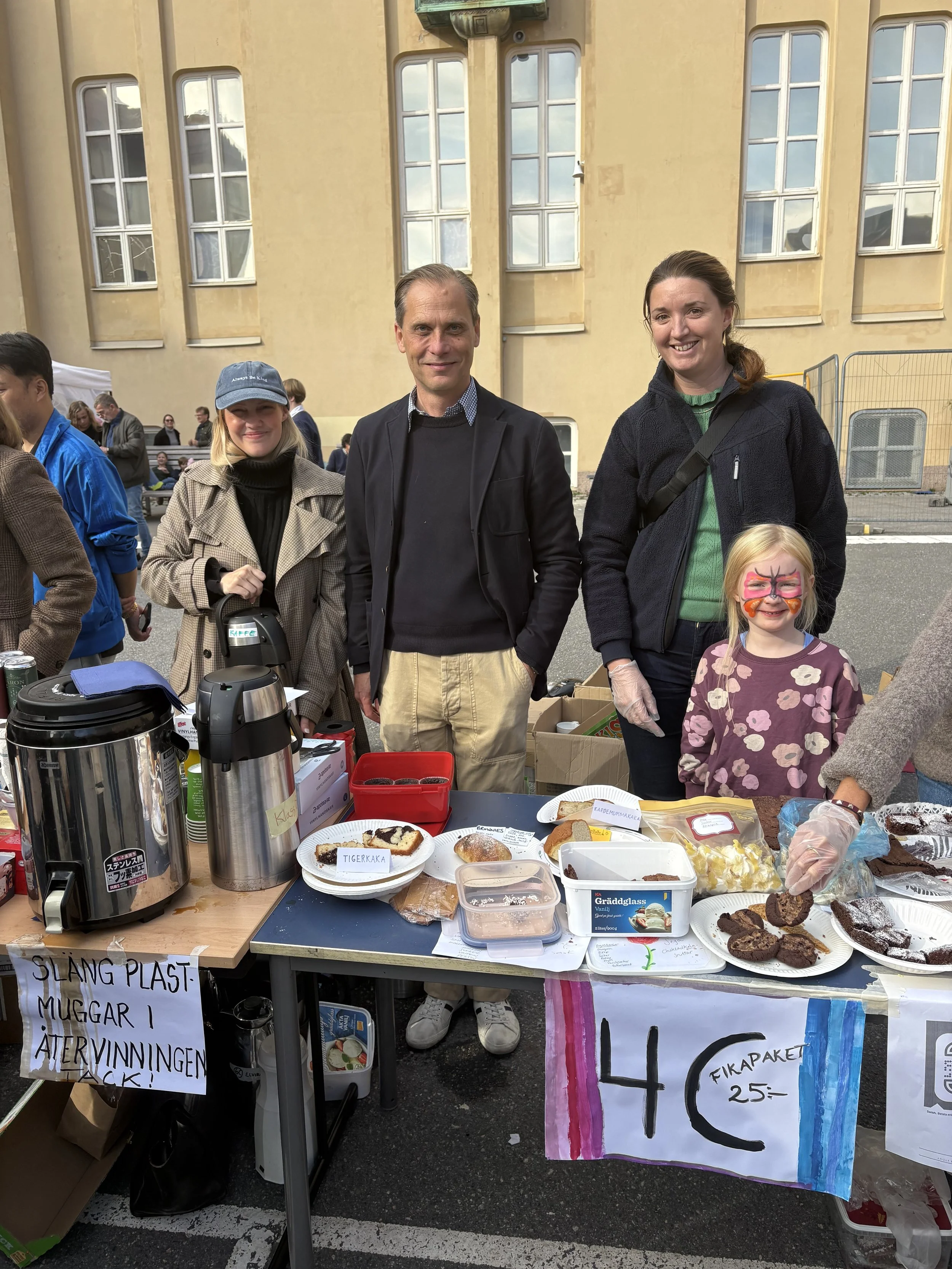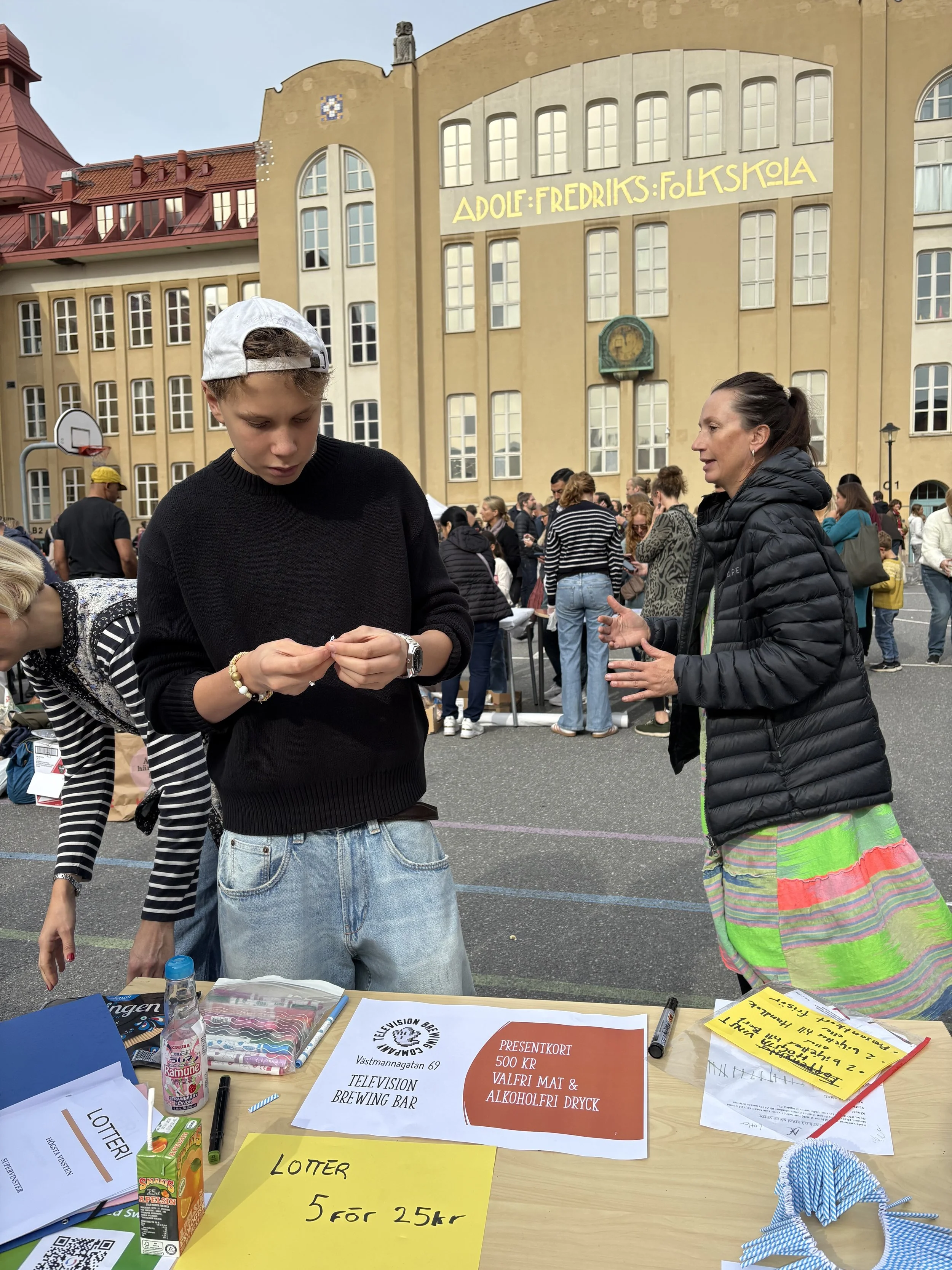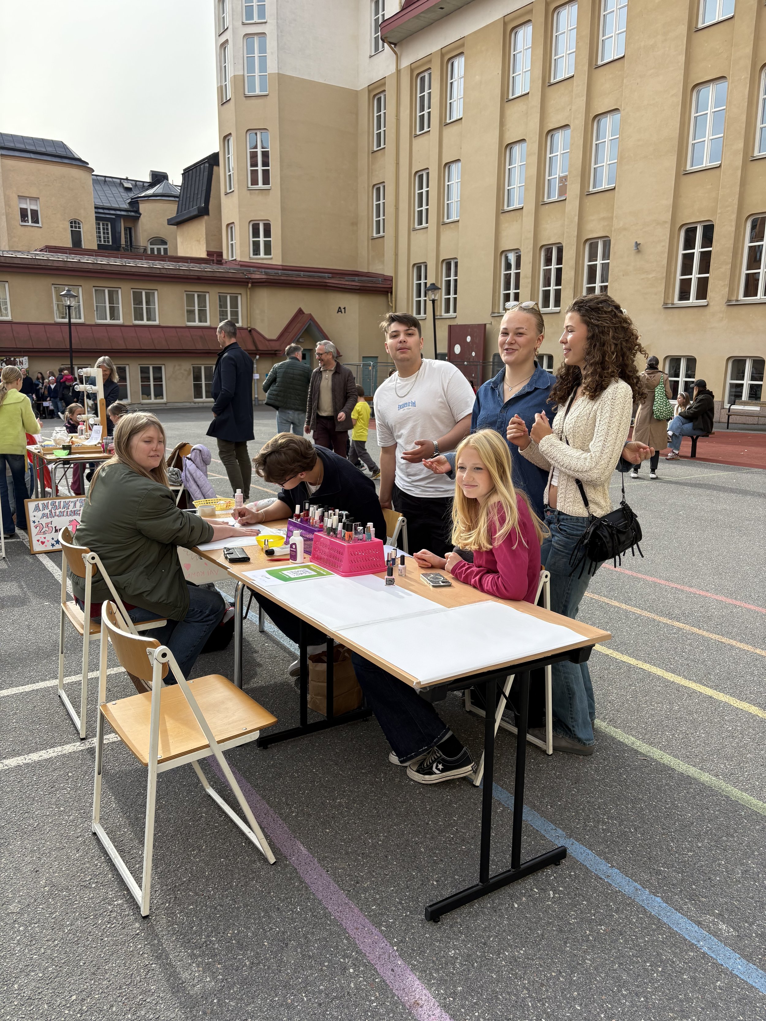 På skolgården doftar det av nygrillade hamburgare, popcorn och nybakat fika, och mellan stånden ringlar köer till lotterier, chokladhjul, sockervadd, sumobrottning och loppis. I varje hörn pågår något – manikyrstationen, ansiktsmålningen och de tävlingarna med roliga priser. Varje årskurs har sin uppgift, och tillsammans skapas en färgstark och generös fest som speglar skolans hjärta: musiken, kreativiteten och samarbetet.
